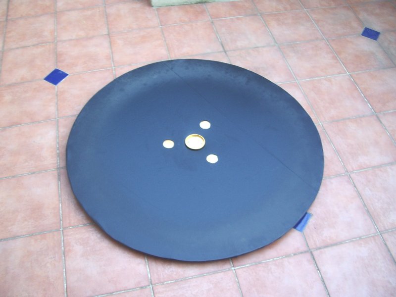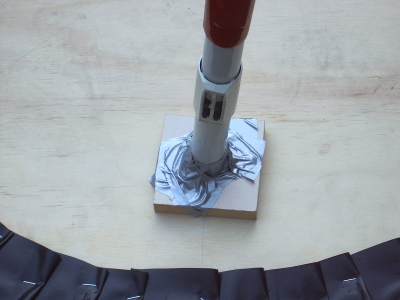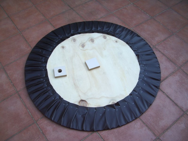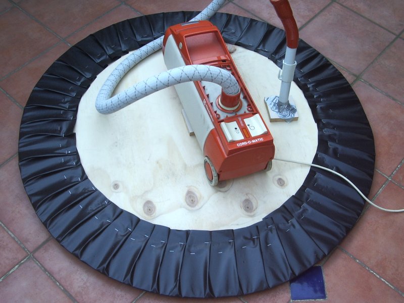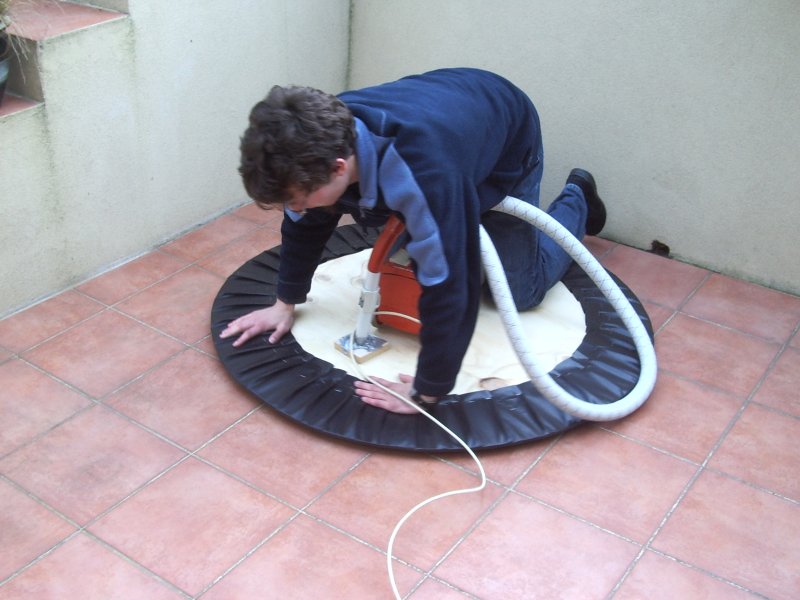 I first went to Second Treasure (the recycling centre at the dump), and bought a vacuum cleaner, as well as several pieces of wood which I didn't end up using. On Sunday 19-6-2005 afternoon, I went to Mitre 10 and bought the plywood (1200x1200x12mm untreated), black polythene sheet (2x2m of the thickest grade available), tacks (which I didn't use in the end) and duct tape. I constructed the first hovercraft on Sunday afternoon and Monday. It works well on tiles and reasonably well even on carpet, but unfortunately I don't have any large smooth area to test it properly. It is necessary to balance carefully or the edges touch the ground, significantly increasing friction (and wearing out the polythene sheet). When unloaded, it tends to start vibrating, which increases friction. Fortunately this isn't a problem when it has a passenger.