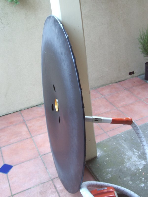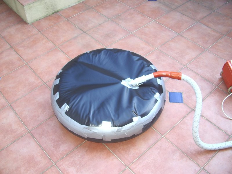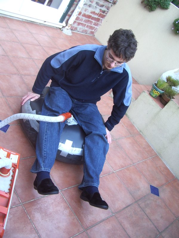 After demonstrating the main hovercraft (described above) to some people and discussing it with them, I decided to try a different, simpler design based on a tyre tube. Unfortunately this design didn't work very well. When unloaded, it vibrates worse than the main design. It is also more difficult to balance properly so that the sides don't rub against the ground.