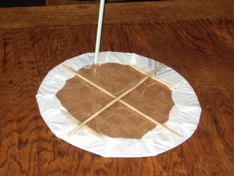 I started by building a small prototype model from cardboard and a plastic shopping bag, powered by first a balloon and then a small air pump intended for blowing up Lilos etc.. Skewers were required to stop the cardboard bending too much. This model worked quite well.